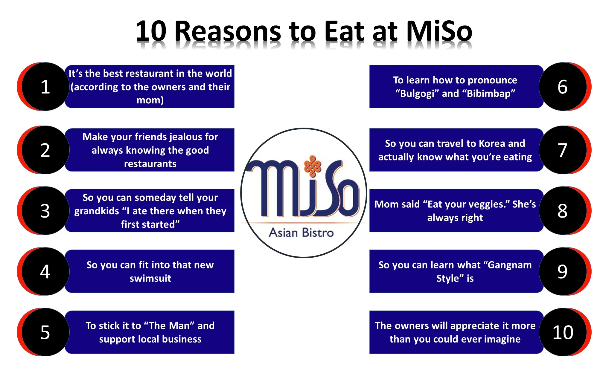 Every restaurant (and business) needs to have core values that inspire it. Here are MiSo’s 3 main motivations of the guest experience, healthy food, and spreading Korean culture.